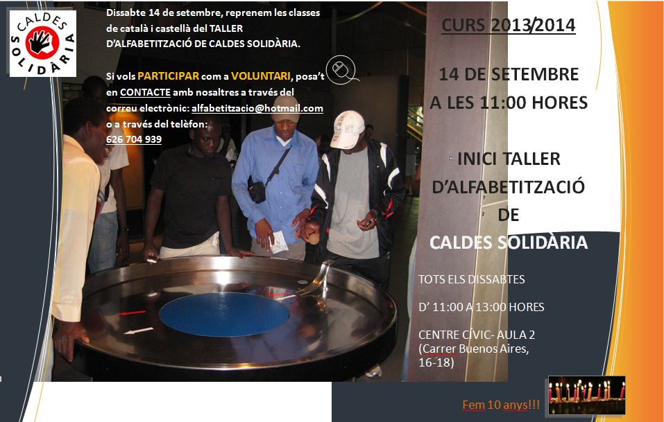 Després de les vacances d’estiu reprenem amb ganes el taller d’alfabetització de Caldes Solidària que realitzem els dissabtes al centre cívic i aquesta vegada ho fem en ple aniversari: ja són 10 anys del taller tal i com es coneix ara!!!